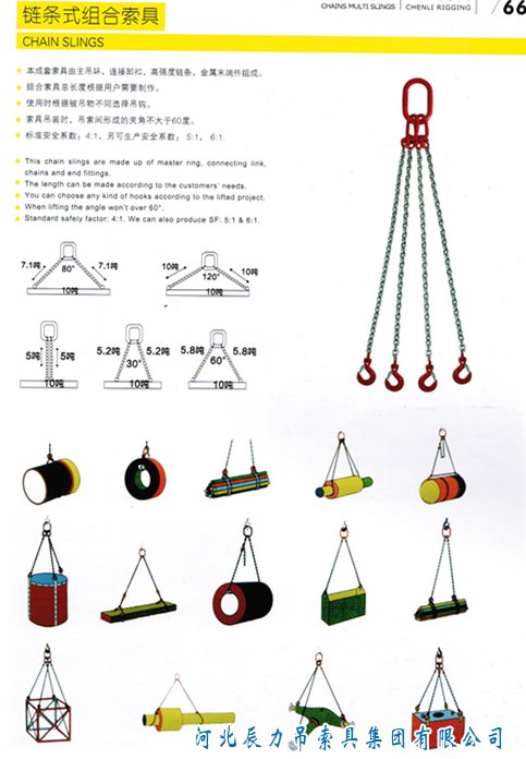 圖為辰力公司產(chǎn)品介紹冊中的一頁。正如圖中展示,辰力生產(chǎn)多種吊索具類產(chǎn)品,起重鏈條、***環(huán)(子母環(huán))、環(huán)眼鉤等。圖中還為大家展示了鏈條式組合索具的集中吊裝方式,希望能夠幫到您。聯(lián)系電話:0312-8037111