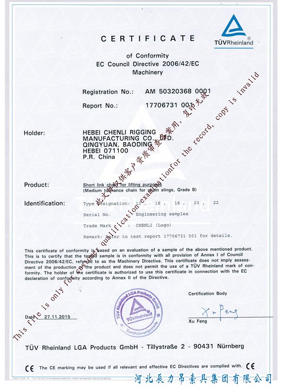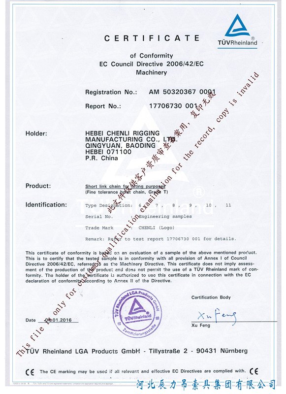辰力起重鏈條生產商是中國***,也是一家獲得CE起重鏈條認證的廠家。CE起重鏈條是一種安全認證的標志,是辰力起重鏈條制造商打開并進入歐洲市場的護照。在歐盟市場“CE”標志屬強制性認證標志,不論是歐盟內部企業生產的起重鏈條,還是其他***生產的起重鏈條,要想在歐盟市場上自由流通,就必須加貼“CE”標志。