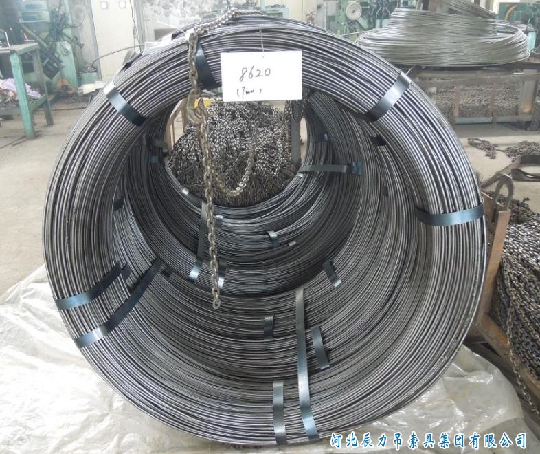 辰力起重鏈條的原材料叫盤條,原材料在進(jìn)廠前先需要拔絲,8mm以下的規(guī)格6mm,6.3mm,7mm,7.1mm,8mm用的是8mm的盤條拔絲的。10mm用的還是10mm的。11mm,12mm,13mm用的是13mm的拔絲的。14mm,16mm用的是16mm拔絲的。盤條到廠后,先需要嚴(yán)格的檢測,用千分尺(精度為千分之一)測量料徑,用硬度檢測儀檢測硬度(布氏硬度在140-170之間)。都合格了才進(jìn)車間。