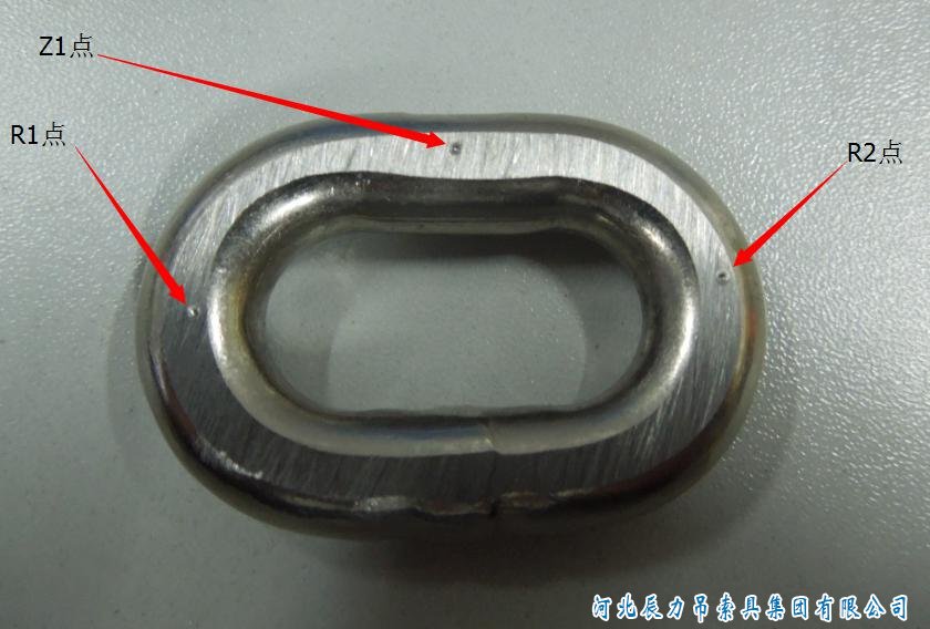 起重鏈條的硬度檢測(cè)是在熱處理的過(guò)程中進(jìn)行檢測(cè)的,隨機(jī)截取其中的一個(gè)鏈環(huán),然后打磨成平面,在用硬度檢測(cè)儀進(jìn)行檢測(cè)。檢測(cè)的位置有3個(gè),如圖所示: